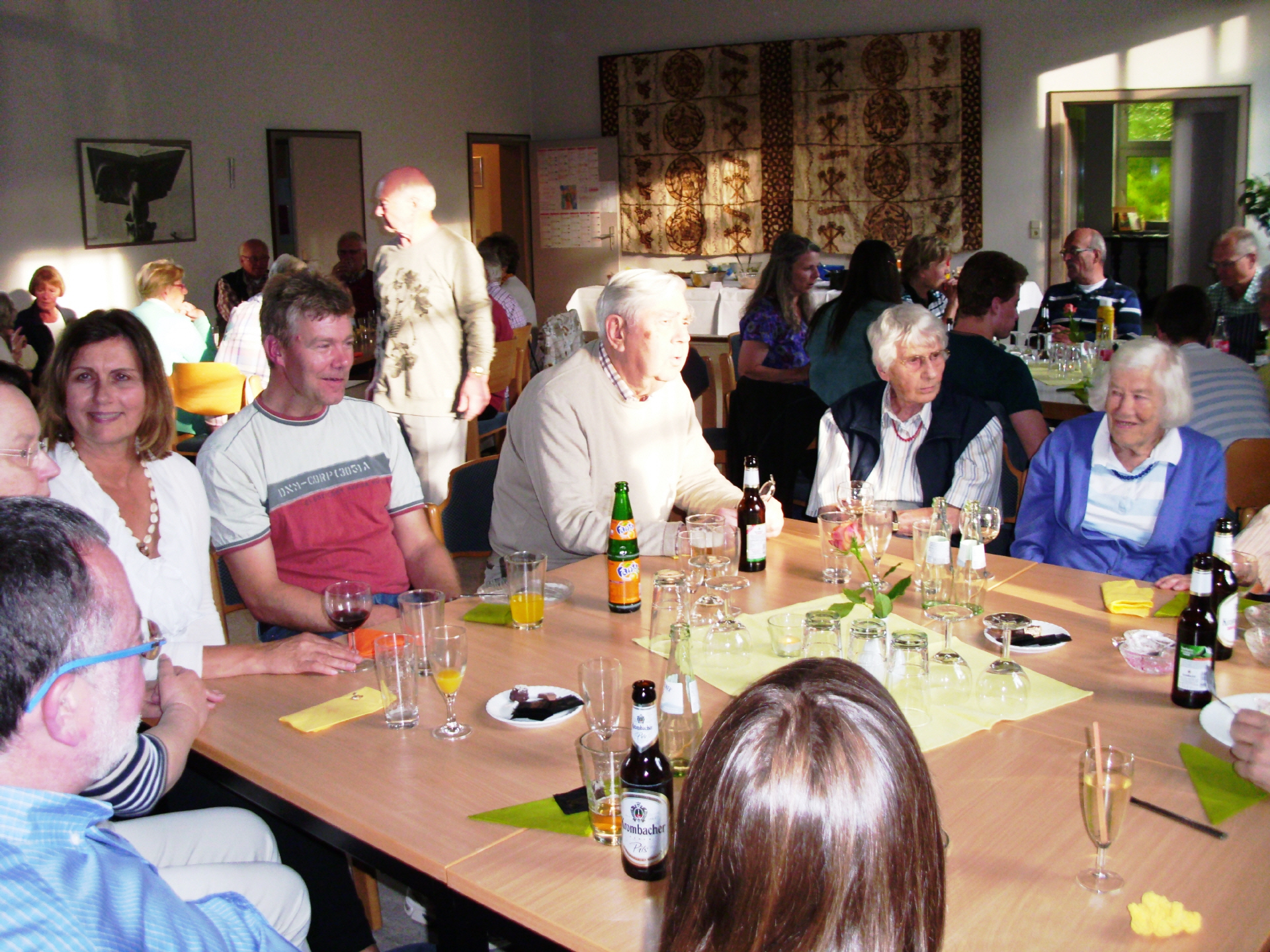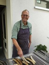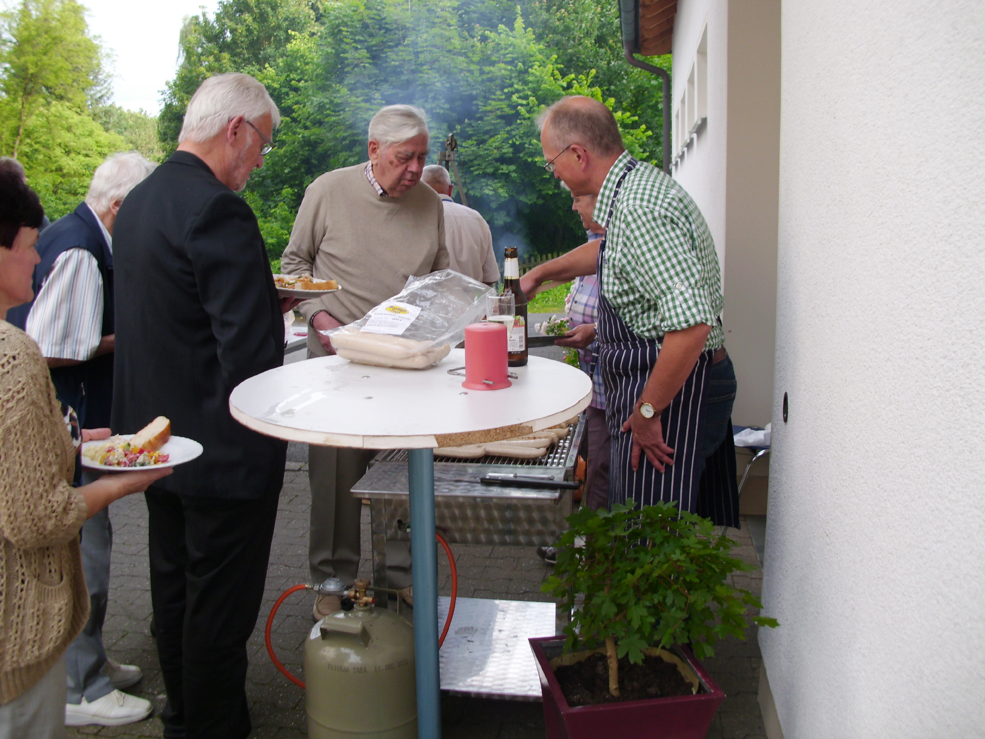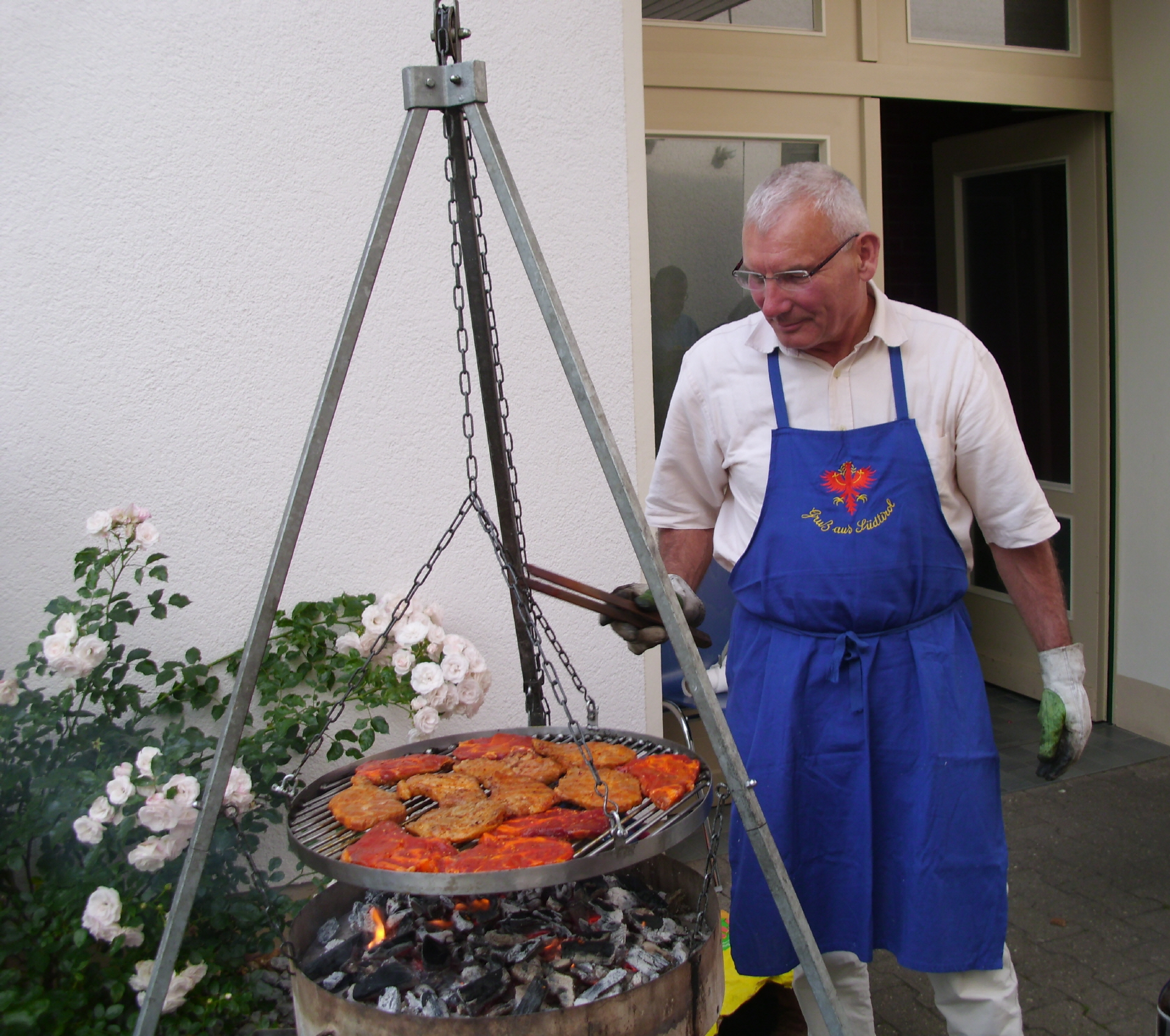 Es ist ein guter Brauch, dass das Presbyterium alle offiziell im Gemeindedienst Beschäftigte und die vielen ehrenamtlich Tätigen einlädt, um ihnen für ihren Einsatz zu danken. An dieser Stelle die Bitte um Entschuldigung, dass auf Grund eines Computerfehlers einige die Einladungen nicht erhielten. Auch wenn das Wetter nicht so ganz mitspielte - man wollte bei sommerlichem Wetter draußen mit Gegrilltem und Getränken zusammensitzen - war es dann eine gemütliche Runde im Saal. Draußen am Grill standen als Grillmeister Pfarrer Dr. Weiling und der Presbyter Detlef Klimke.