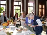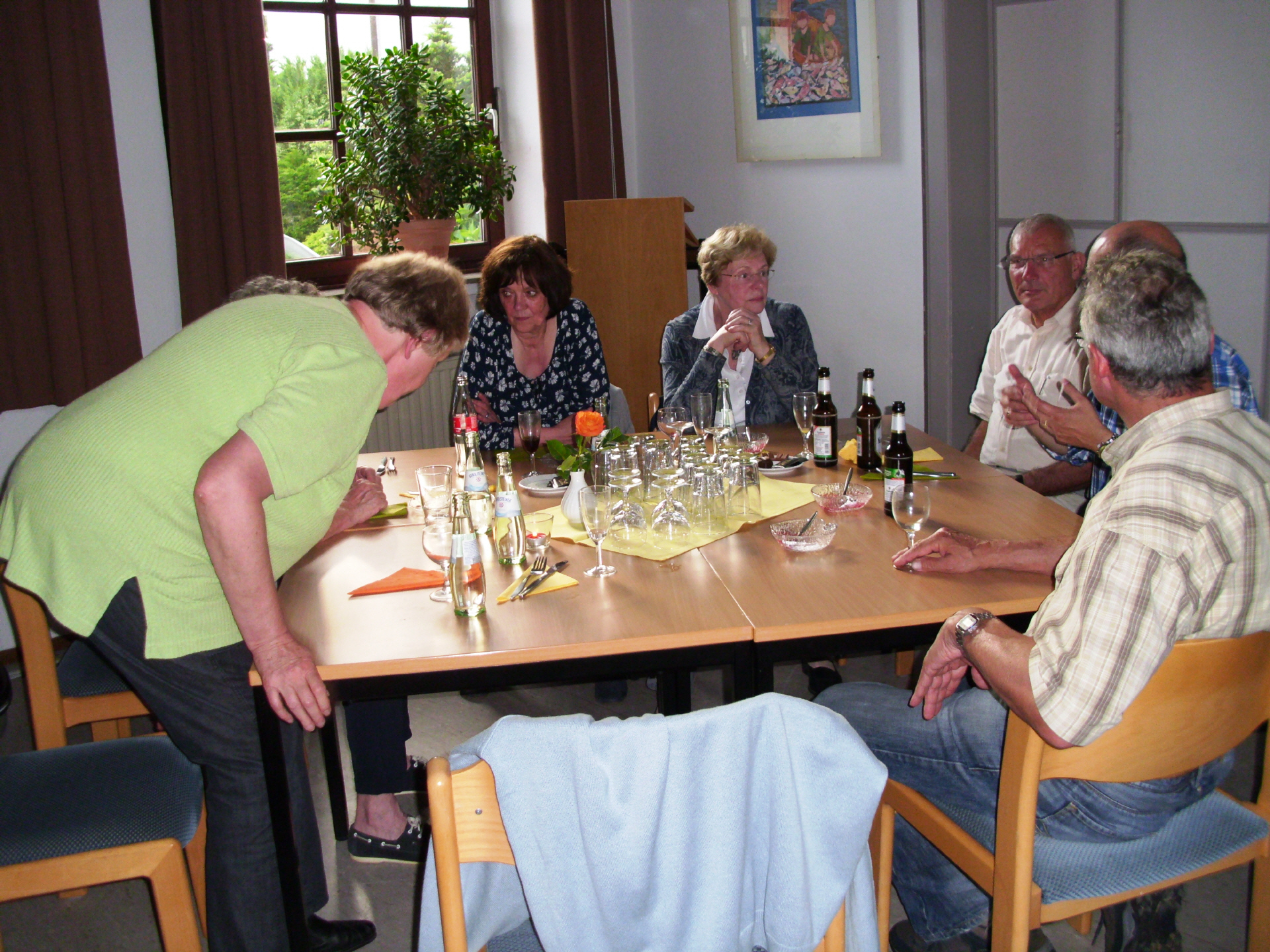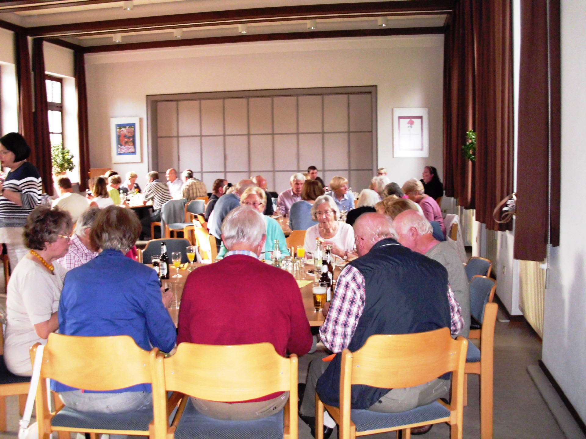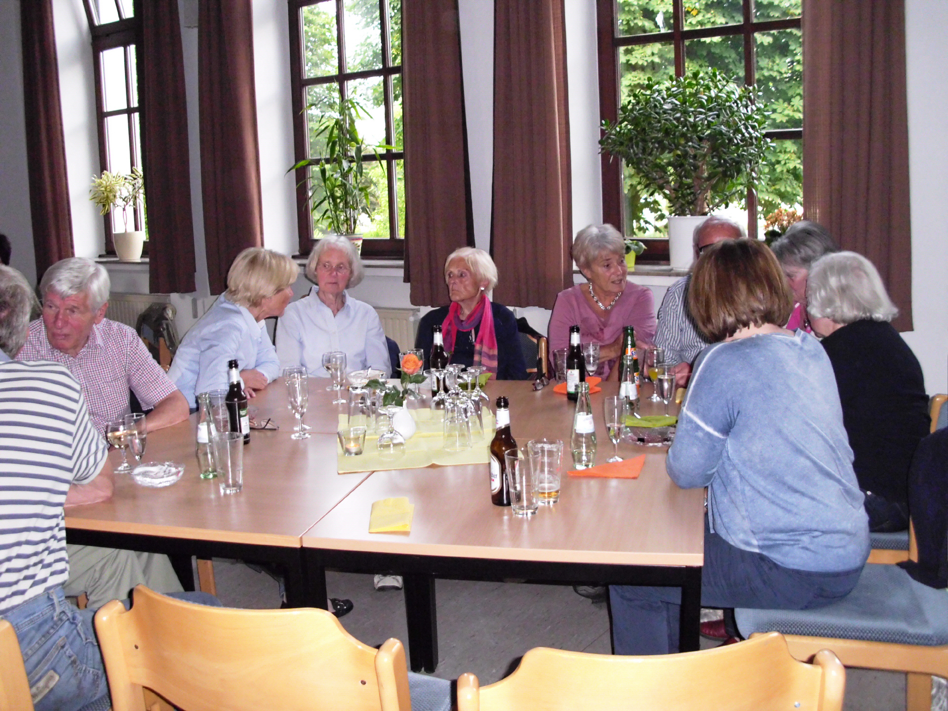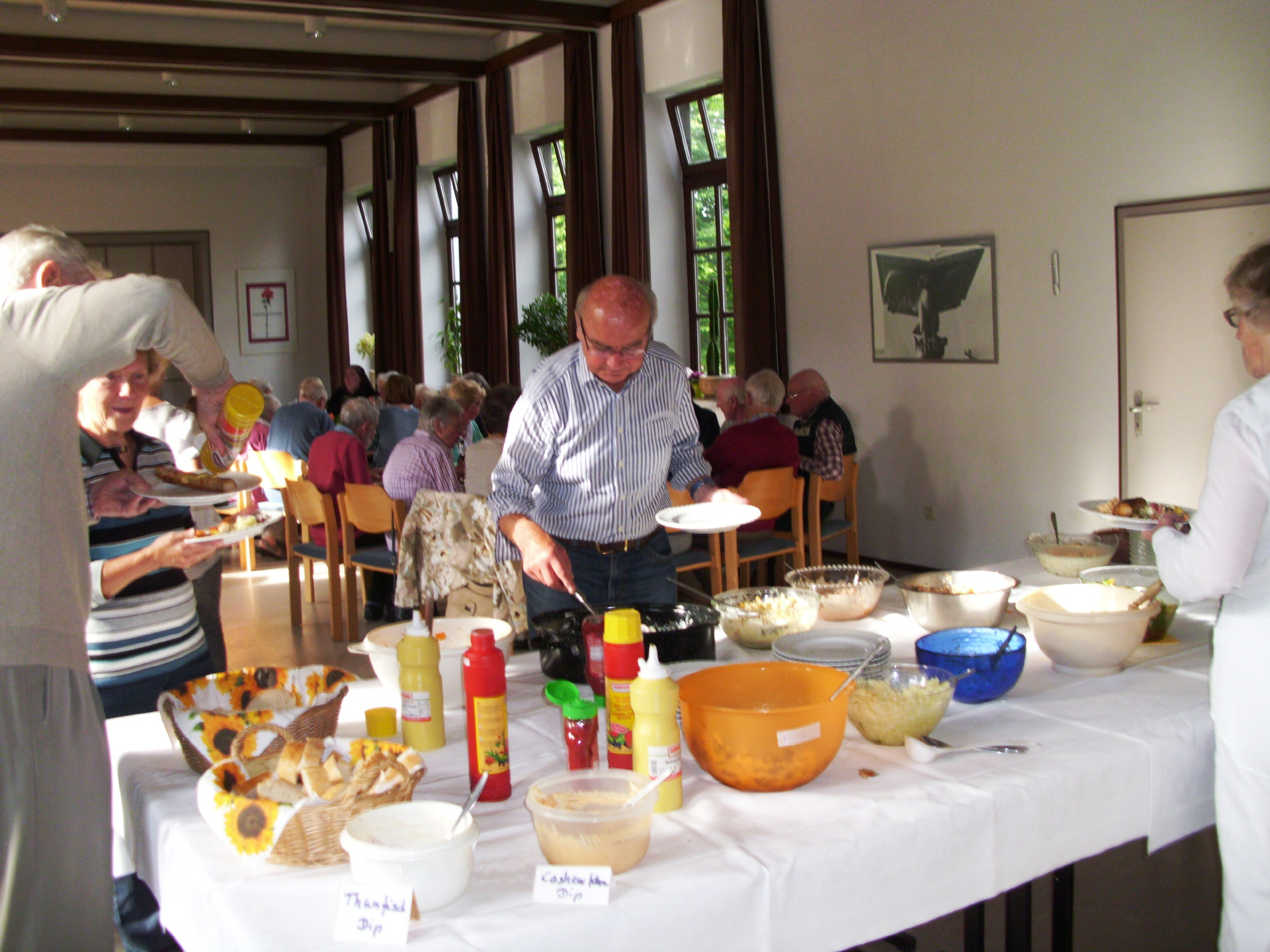 Es ist ein guter Brauch, dass das Presbyterium alle offiziell im Gemeindedienst Beschäftigte und die vielen ehrenamtlich Tätigen einlädt, um ihnen für ihren Einsatz zu danken. An dieser Stelle die Bitte um Entschuldigung, dass auf Grund eines Computerfehlers einige die Einladungen nicht erhielten. Auch wenn das Wetter nicht so ganz mitspielte - man wollte bei sommerlichem Wetter draußen mit Gegrilltem und Getränken zusammensitzen - war es dann eine gemütliche Runde im Saal. Draußen am Grill standen als Grillmeister Pfarrer Dr. Weiling und der Presbyter Detlef Klimke.