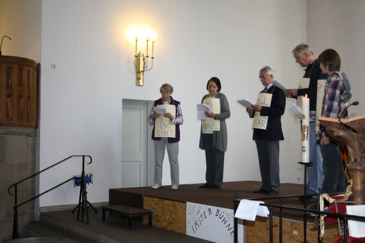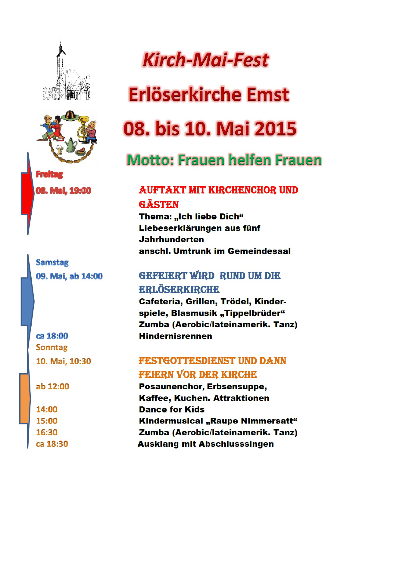 Kirchmaifest zum 55-jährigem der Erlöserkirche Emst (28./29.Mai 2011) Das war ja ein gelungenes Fest. Das Jubiläumswochenende war rund um die Erlöserkirche und in der Erlöserkirche selber gut gefüllt, und viele Aktivitäten wie Tanzaufführung, Kostprobe der Band „Sinnflut“, Fotoausstellung, Diaschau und vieles mehr trugen zu einem guten Gelingen bei. Der Festgottesdienst wurde, mitgestaltet vom Kindergarten, einer symbolischen Theateraufführung, sowie dem Posaunenchor. Und im Jahr der Taufe gab es auch am Sonntag eine Taufe.